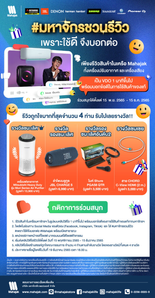 มหาจักรชวนรีวิว กิจกรรมดี ๆ มีของรางวัลมาแจก!! เพียงรีวิวสินค้า ในเครือบริษัท Mahajak ไม่ว่าจะเป็น เครื่องปรับอากาศ Mitsubishi Heavy Duty, เครื่องเสียง JBL , DENON, Harman Kardon, Shure , Soundcraft, Crown, Pioneer DJ และอื่น ๆ ลุ้นรับ
