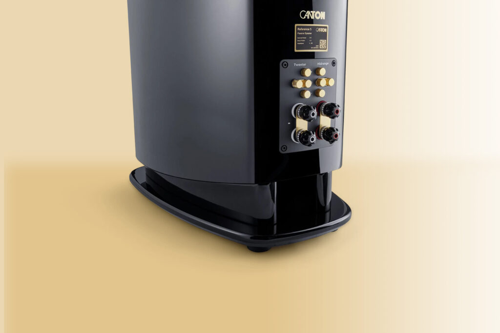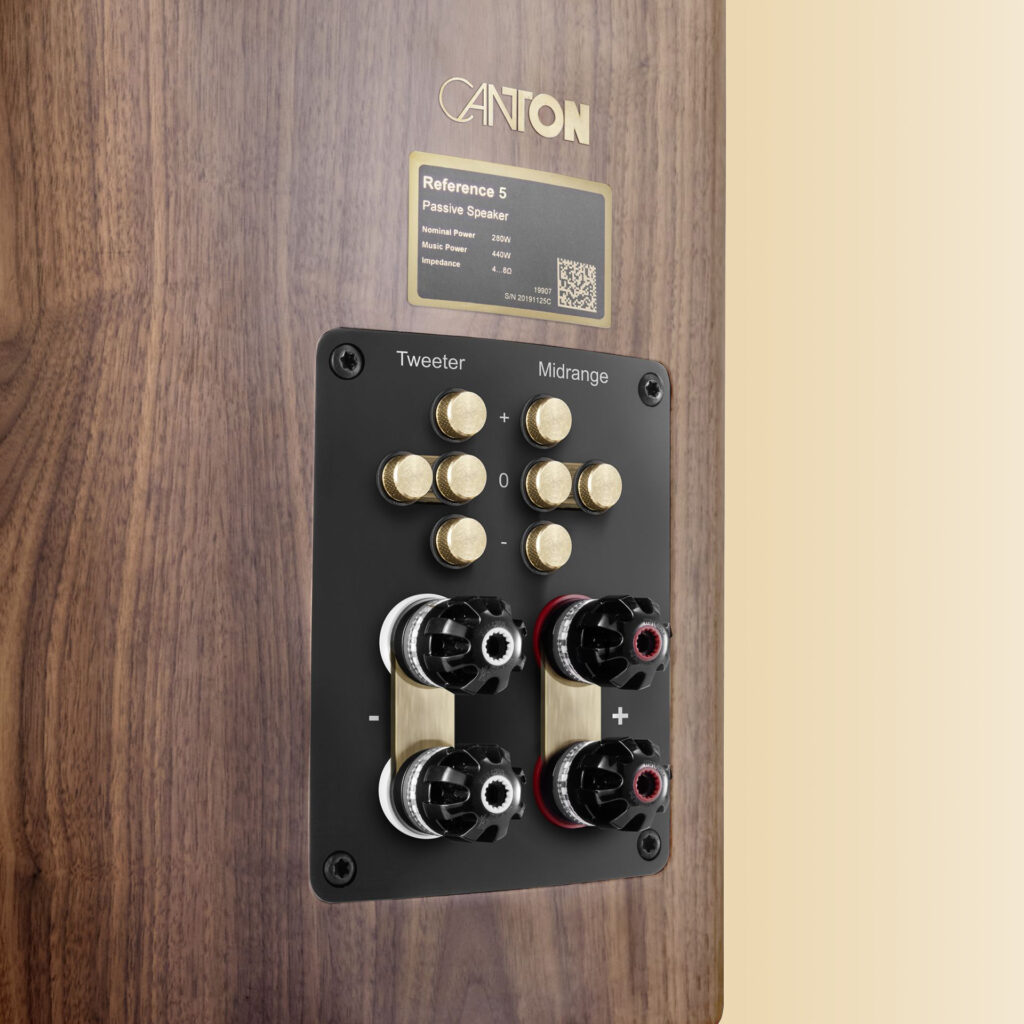 แผงหลังตัวตู้ติดตั้งขั้วเสียบต่อสายลำโพงคุณภาพสูง ซึ่งเป็นของ WBT Nextgen และเป็นแบบ Bi-Wire โดยมี  “สะพานต่อเชื่อม” ชุบทองอย่างดี (Gold-Plated Bridges) ให้มาด้วย ที่สำคัญ Reference 5 ยังมี “Physical Taps” จำนวน 2 ชุด ติดตั้งมาให้อีกด้วย เพื่อเอื้ออำนวยให้ผู้ใช้สามารถเพิ่ม หรือ ลดเอาต์พุตทวีตเตอร์ รวมทั้งมิดเรนจ์ได้+หรือ -1.5dB โดยเป็นอิสระจากกัน ซึ่ง Canton อธิบายว่า นี่คือเทคโนโลยี “การชดเชยห้อง” (Room Compensation หรือ RC) ซึ่งแน่นอนว่า ทั้งหมดเป็นแบบอะนาลอก