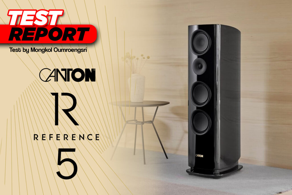 ในครั้งนี้ผมได้มีโอกาสทดลองฟัง Reference 5 ซึ่งเป็นลำโพงตั้งพื้นแบบ 3-ทาง ที่มีน้ำหนัก 79.3 ปอนด์ หรือ 36 กก. ความสูง 39.7 นิ้ว ความกว้าง 11.8 นิ้ว และความลึก 18.1 นิ้ว ดังนั้นจึงเป็นตู้ลำโพงที่ใหญ่แต่ไม่ใหญ่มาก เรียกได้ว่า ไซซ์กำลังเหมาะกับห้องโดยทั่วไป โดยไดรเวอร์ที่ใช้ทั้งในส่วนของวูฟเฟอร์และมิดเรนจ์เป็นวัสดุพิเศษอย่างที่ Canton เรียกขานว่า BCT Diaphragm (Black Ceramic Tungsten) วูฟเฟอร์ขนาด 6.85 นิ้ว จำนวน 2 ตัว และมิดเรนจ์ขนาด 6.85 นิ้ว จำนวน 1 ตัว ซึ่งมาพร้อมกับทวีตเตอร์แบบ BC (Black Aluminium Oxide Ceramic) ขนาด 1 นิ้ว ซึ่งทั้งหมดทำให้ Reference 5 สามารถครอบคลุมช่วงความถี่ตอบสนองได้ตั้งแต่ 21 จนถึง 40,000 Hz ด้วยค่าความไวเสียง 88 dB กำหนดจุดตัดกรอง/แบ่งช่วงความถี่ (Crossover Frequencies) อยู่ที่ 170/3,000 Hz ค่าอิมพีแดนซ์ 4/8 โอห์ม ภายใต้ระบบการทำงาน 3-ทาง Bass Reflex System โดยท่อเปิดยิงลงพื้น หรือ Downfiring กระจายไปทางด้านหน้าและด้านหลังตัวตู้ลำโพง ด้วยสิ่งที่เรียกว่า Bass-Guide