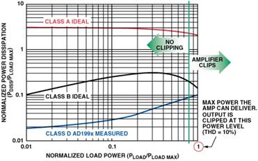 รูปที่ 4. เปรียบเทียบการกระจายพลังงานในขั้นตอนเอาต์พุตในอุดมคติ (PDISS) สำหรับเครื่องขยายเสียงคลาส A และคลาส B กับการกระจายพลังงานที่วัดได้สำหรับเครื่องขยายเสียงคลาส D “AD1994” โดยเปรียบเทียบกับพลังงานที่ส่งไปยังลำโพง (PLOAD) โดยได้รับสัญญาณคลื่นไซน์ความถี่เสียง (Audio-Frequency Sine Wave Signal) ตัวเลขพลังกำลังขับ (Power) ได้รับการทำให้เป็นมาตรฐานตามระดับพลังงาน PLOAD สูงสุด (PLOAD max) ซึ่งสัญญาณคลื่นไซน์จะถูกตัดทอทอนจนทำให้เกิดความผิดเพี้ยนฮาร์โมนิกรวม (THD) ที่ 10% เส้นแนวตั้งระบุ PLOAD ที่การตัดทอนเริ่มต้น