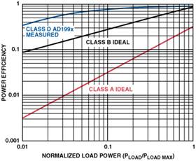 Figure 5. Power Efficiency of Class A, Class B, and Class D Output Stages.