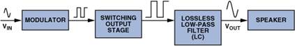 เนื่องจากสัญญาณเสียงส่วนใหญ่ไม่ใช่พัลส์เทรน (Pulse Trains) จึงต้องมีโมดูเลเตอร์ (Modulator) เพื่อแปลงอินพุตเสียงเป็นพัลส์ เนื้อหาความถี่ของพัลส์ประกอบด้วยสัญญาณเสียงที่ต้องการ Desired Audio Signal และพลังงานความถี่สูงที่เป็นัยสำคัญ (Significant High-Frequency Energy) ซึ่งเกี่ยวโยงกับกระบวนการมอดูเลชัน (Modulation Process) ตัวกรองปล่อยผ่านความถี่ต่ำ (Low-Pass Filter) มักจะถูกแทรกไว้ระหว่างขั้นตอนเอาต์พุตกับลำโพง เพื่อลดสัญญาณรบกวนแม่เหล็กไฟฟ้า (EMI) และหลีกเลี่ยงการขับลำโพงด้วยพลังงานความถี่สูงมากเกินไป ตัวกรอง (รูปที่ 3) จะต้องไม่มีการสูญเสีย (หรือเกือบจะไม่มีการสูญเสีย) เพื่อรักษาข้อได้เปรียบด้านการกระจายพลังงาน (Power-Dissipation Advantage) ของขั้นตอนเอาต์พุตแบบสวิตชิ่ง ตัวกรองปกติจะใช้ตัวเก็บประจุและตัวเหนี่ยวนำ โดยองค์ประกอบเพื่อการกระจายพลังงานโดยตั้งใจเพียงอย่างเดียวคือ ลำโพง
