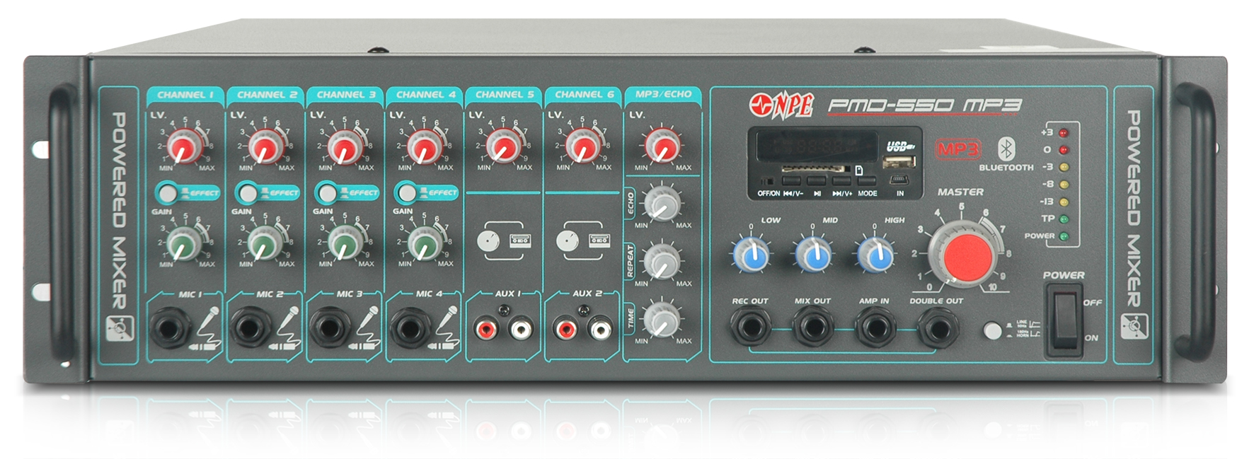 เพาเวอร์มิกเซอร์ PMD-250 MP3, PMD-350 MP3, PMD-550 MP3 มีระบบ 70V/100V สามารถใช้ไฟได้ 2 ระบบ 220 VAC แบตเตอรี่ 12 VDC ในรุ่น PMD-250 MP3 และ 24VDC ในรุ่น PMD-350 MP3, PMD-550 MP3 พร้อมด้วย MP3 Player+FM, ไฟล์ MP3 จาก USB Port และ SD Card พร้อมการเชื่อมต่อผ่านสัญญาณ Bluetooth ใช้งานง่ายติดตั้งสะดวก กำลังขยาย 250Wmax, 350Wmax, 550Wmax พร้อมพัดลมระบายความร้อน อินพุตแบบบาลานซ์และวอลลุ่ม MIC1-4 แบบ TRS,AUX1-2 แบบ RCA เอาท์พุท REC,MIX,AMP IN,DOUBLE OUT แบบ TRS, Speaker แบบ Push Terminal มีฟังชั่น Digital Echo พร้อมวอลลุ่มปรับเสียง Echo,Time,Repeat และมีสวิทช์เลือกใช้งานอิสระ มีปุ่มปรับเสียง Master/Bass/Mid/Treble, สวิตช์ HPF(Horn), LED แสดงผล ON,Signal.Clip