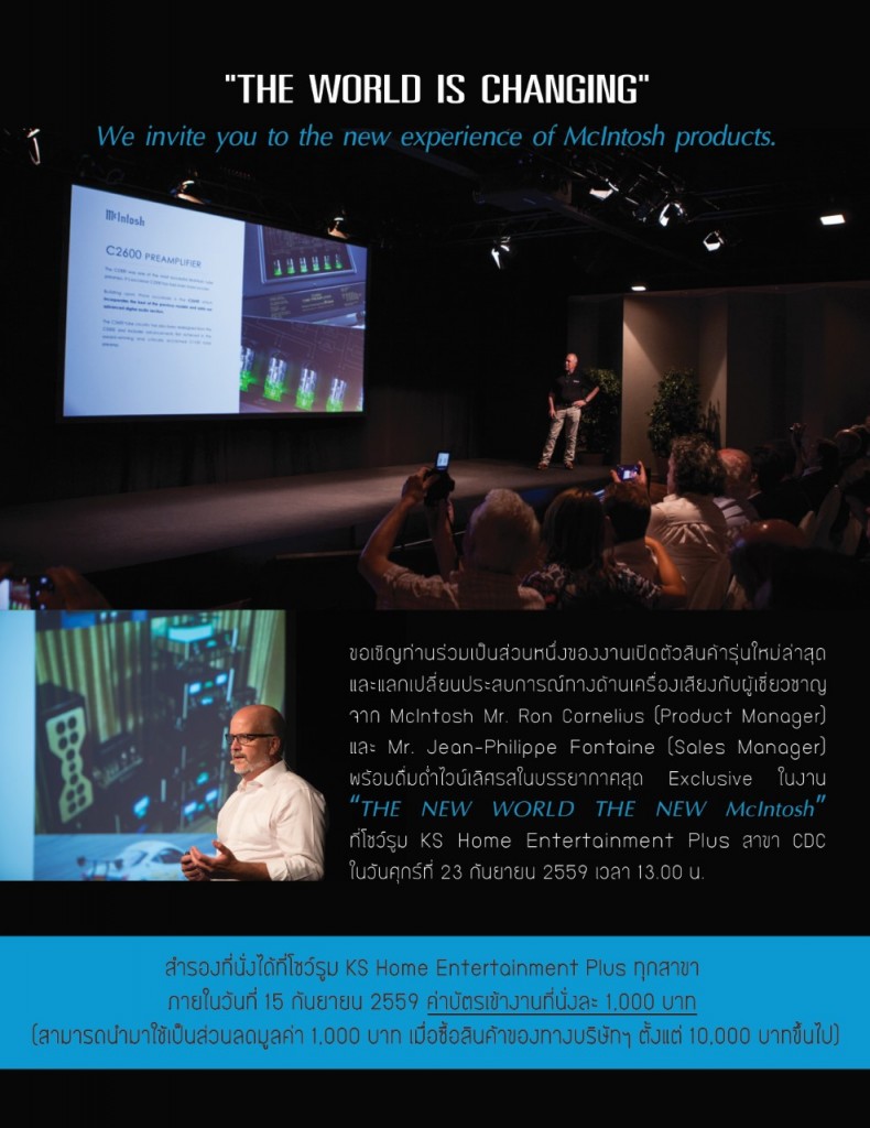 ขอเชิญท่านร่วมเป็นส่วนหนึ่งของงานเปิดตัวสินค้ารุ่นใหม่ล่าสุด และแลกเปลี่ยนประสบการณ์ทางด้านเครื่องเสียงกับผู้เชี่ยวชาญ จาก McIntosh Mr. Ron Cornelius (Product Manager) และ Mr. Jean-Philippe Fontaine (Sales Manager) พร้อมดื่มด่ำไวน์เลิศรสในบรรยากาศสุด Exclusive ในงาน “THE NEW WORLD THE NEW McINTOSH” ที่โชว์รูม KS Home Entertainment Plus สาขา CDC ในวันศุกร์ที่ 23 กันยายน 2559 เวลา 13.00 น.